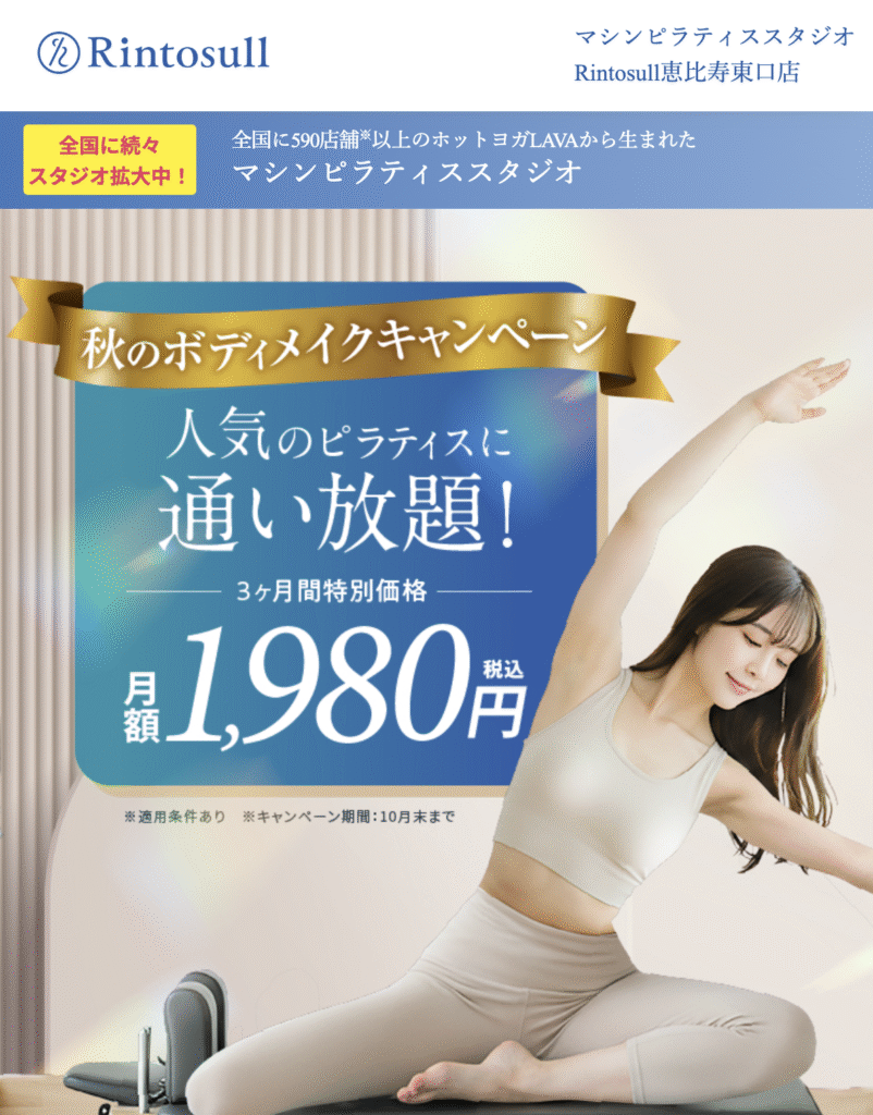 | 体験キャンペーン | グループ(マット):3,300円→1,000円 ※キャンペーン期間2025年10月1日(水)〜28日(火)まで グループ(マシン):5,000円→3,000円 プライベート(マシン):9,900円 |