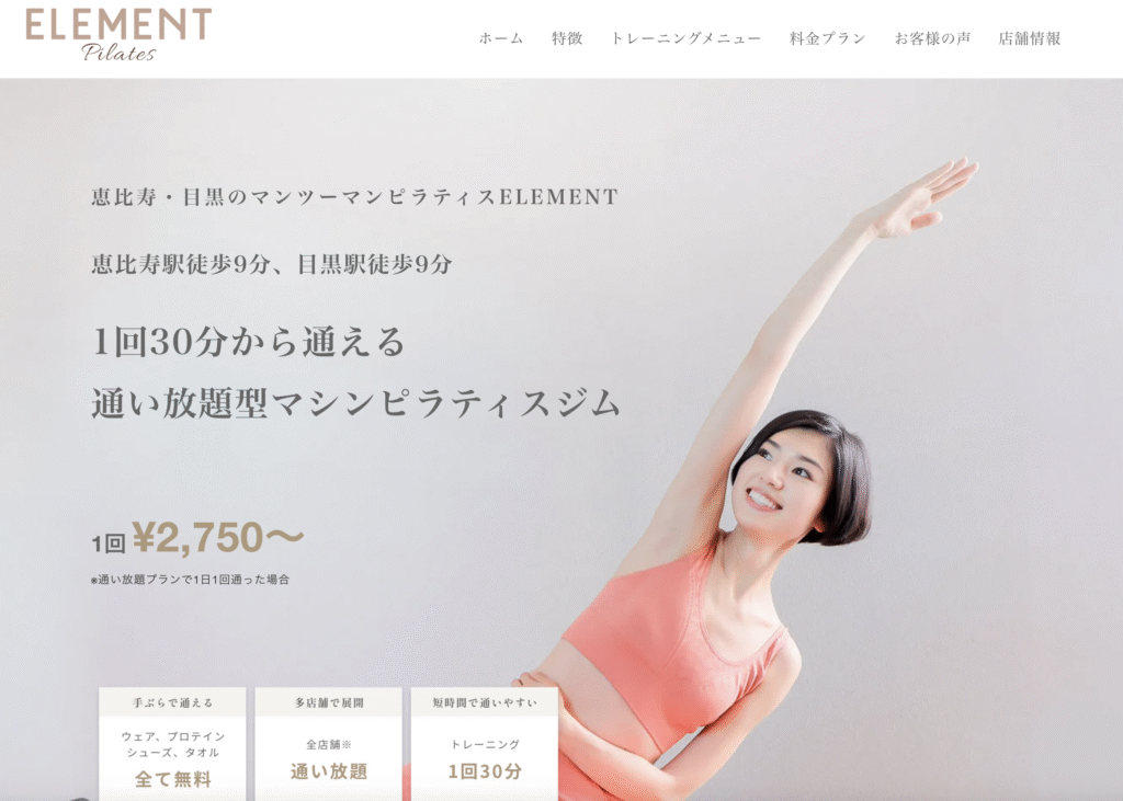 恵比寿でパーソナルのマシンピラティスをもっとも安く始められるのは「ELEMENT 恵比寿店」です。月4回で25,500円、1回あたり6,375円と、立地とサービス内容を考えると非常にコストパフォーマンスに優れています。一般的な恵比寿のパーソナル相場は1回1万円を超えるケースが多いため、毎月数千円単位で費用を抑えながら、完全マンツーマンで質の高い指導を受けられるのは大きな魅力です。