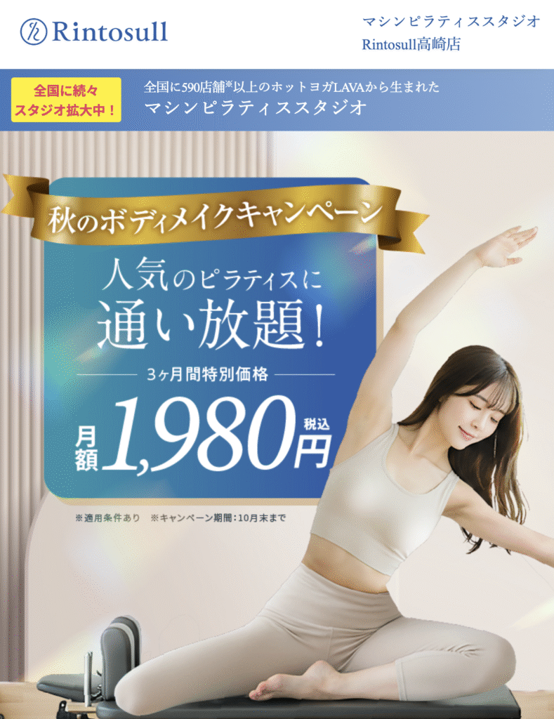 群馬には大手スタジオのグループ型から完全パーソナルまで多様な形式があります。グループレッスンは「Rintosull 高崎店」のように低価格で続けやすく、仲間と一緒に楽しめる点が魅力です。