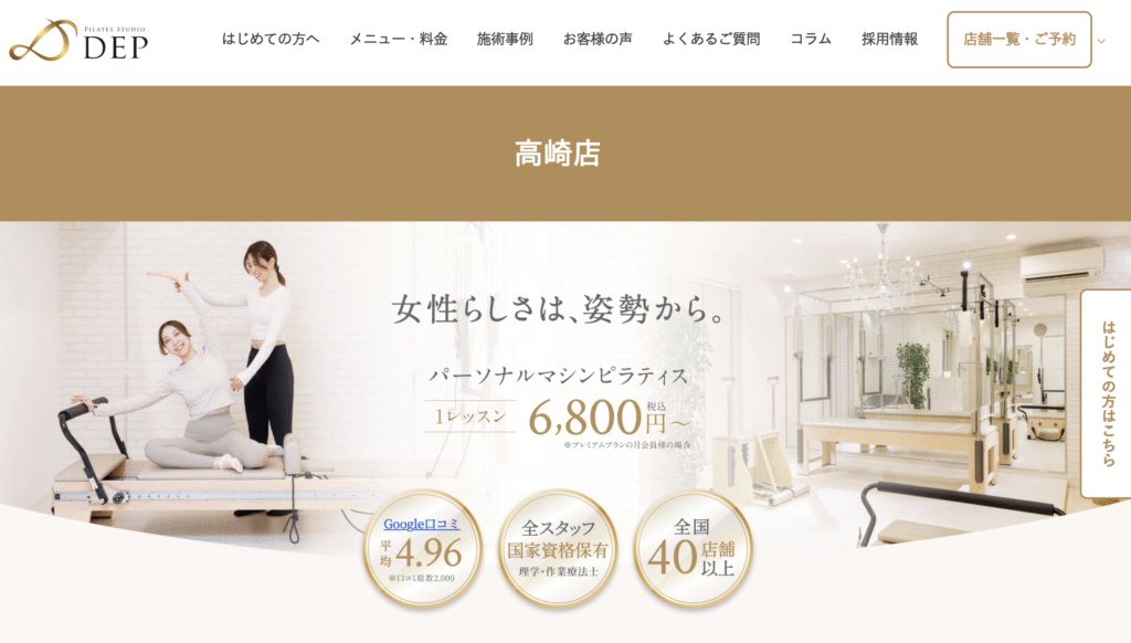 ピラティスK 高崎店は、群馬でもっともアクセスが便利なスタジオのひとつです。高崎駅直結という立地は忙しい女性にとって大きな魅力で、仕事や買い物の合間に通いやすい点が評価されています。グループレッスンが中心ですが、マシンを使った本格的なエクササイズを1回あたり約2,000円台で受講できるコストパフォーマンスの高さも魅力です。