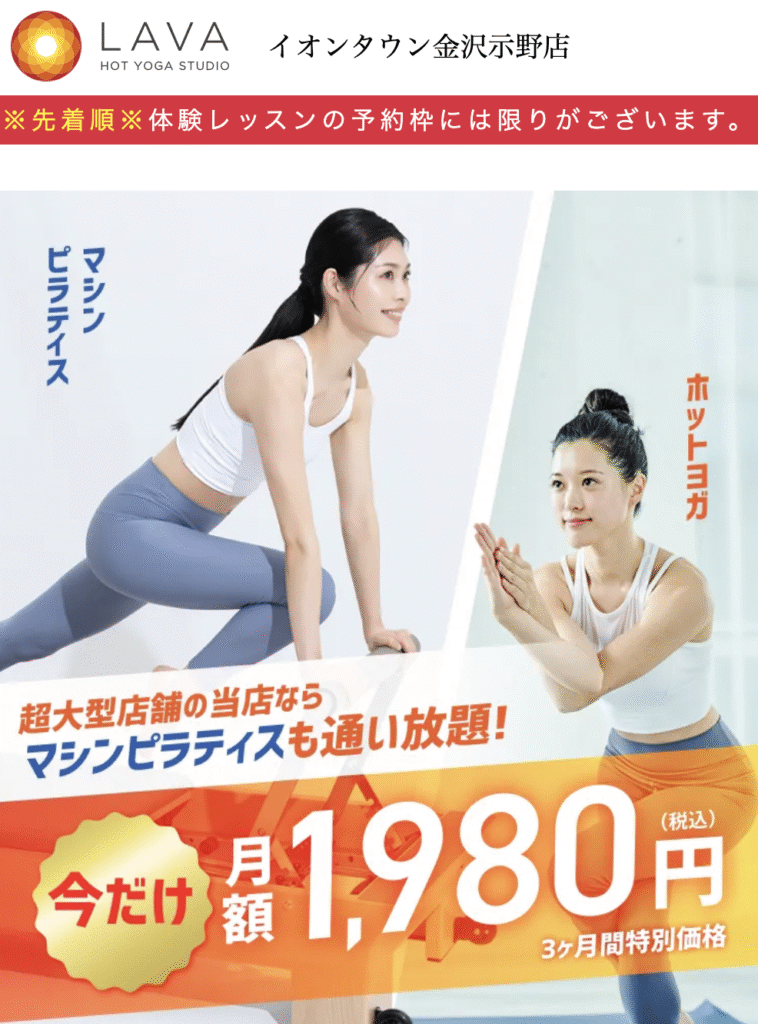 一方、LAVA イオンタウン金沢示野店ではマットやホットピラティスも選べるため、体を温めながら代謝を上げたい女性に人気です。目的に応じて「体幹強化ならマシン」「柔軟性や代謝改善ならマット」と使い分けると効果的です。