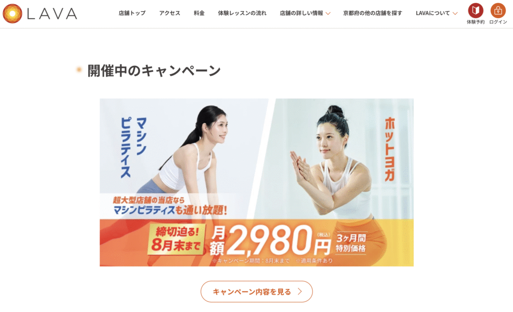 | 体験キャンペーン | グループ(マット):3,300円→1,000円 ※キャンペーン期間2025年10月1日(水)〜28日(火)まで グループ(マシン):5,000円→3,000円 プライベート(マシン):9,900円 |