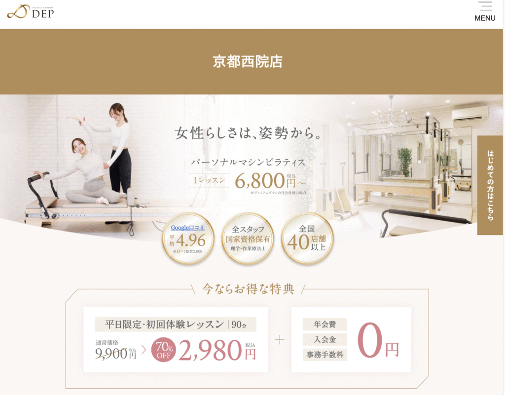 A京都でパーソナルのマシンピラティスは月3〜4万円が目安です。最安クラスはSTUDIO IVY 四条大宮店で月4回28,000円、一般的にはDEP京都西院店やルルト烏丸御池店が月32,000円〜38,400円程度です。グループ制なら月1万円前後から始められます。