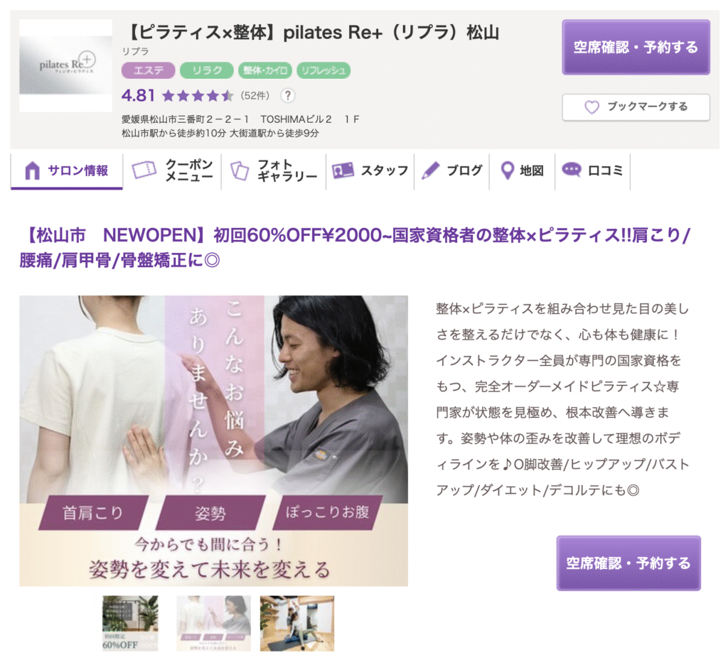 | リプラ松山(Re+) | 整体×ピラティス★根本改善1時間コース:11,000円 | 11,000円 |
