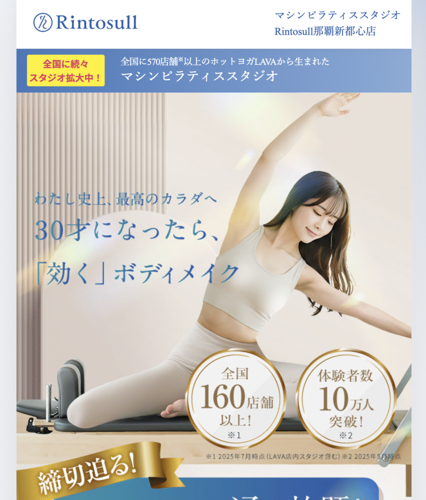 さらに、通い放題プランは複数ブランドが利用できるため、「気分によってヨガやピラティスを選びたい」「短期集中でボディメイクしたい」という方にとっても理想的な環境です。体験は完全無料なので、まずは予約して雰囲気をチェックしてみるのがおすすめです。駅チカ・女性専用・料金も控えめという三拍子揃ったRintosullは、沖縄で気軽にピラティスを始めたい方にぴったりの選択肢といえます。