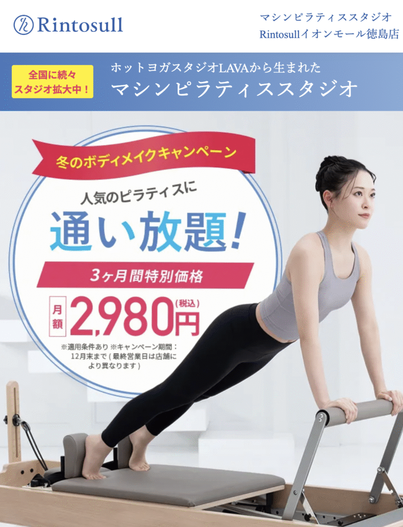 徳島のマシンピラティスは、月額制・都度払い・回数券制の3タイプが主流です。例えば、「Rintosull」は通い放題・月4回といった月額制で、頻度高く通いたい人に適しています。