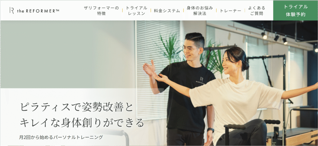 ザ リフォーマーは、マシンピラティスを中心に据えた姿勢改善専門スタジオです。カウンセリングによって姿勢の崩れや体の疲れの原因を徹底的に見極め、脳機能や運動機能、栄養や生活習慣まで含めたトレーニングプログラムを提供します。