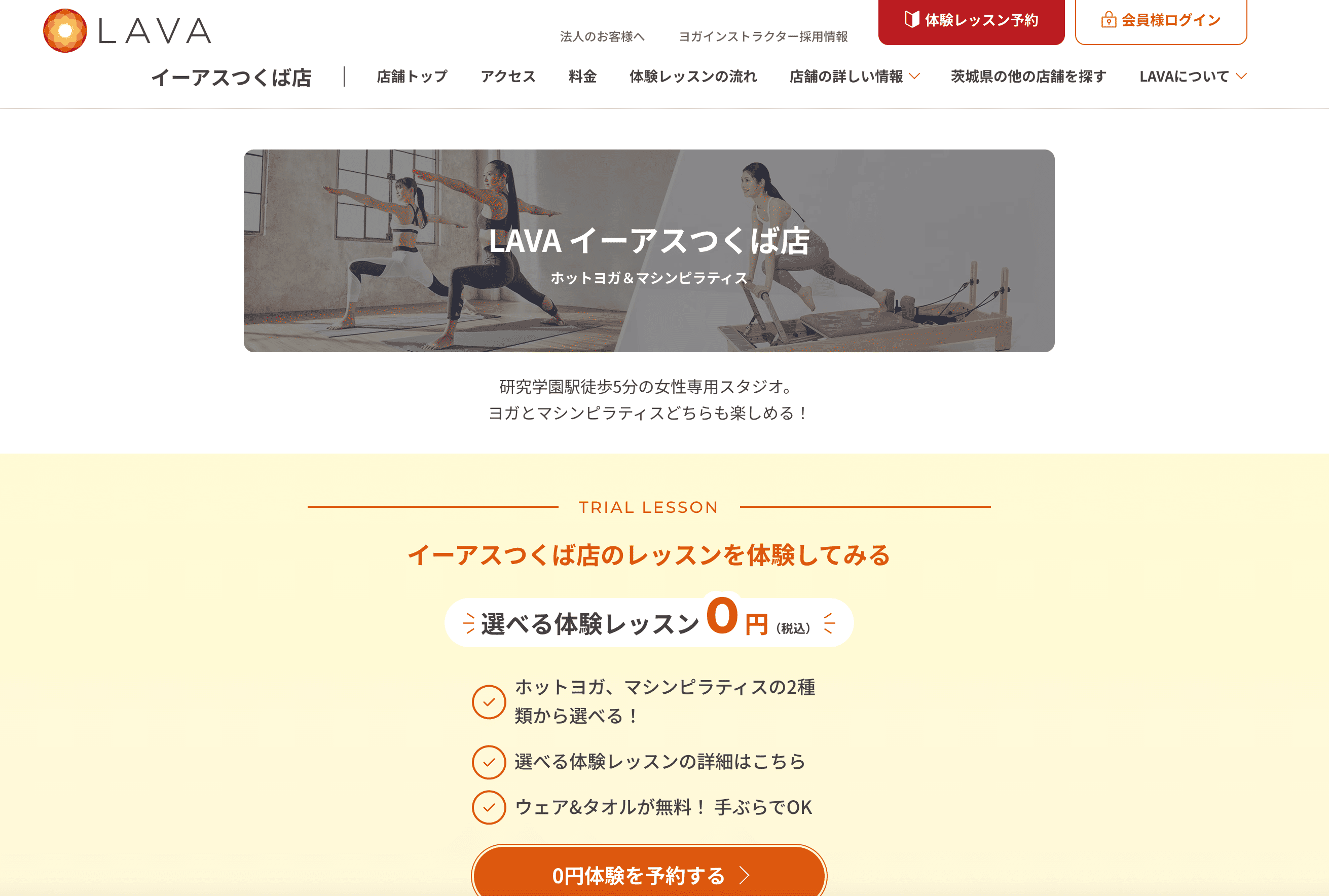| Rintosullイーアスつくば店 | 茨城県つくば市研究学園5-19 イーアスつくば 1Fアウトモール内 | 0120-64-9766 | マシン | 女性専用 | 入会金:5,000円 登録料:5,000円 ※体験会当日入会で入会金、登録料ともに無料 | ※通い放題キャンペーン中3ヶ月間1,980円 月4回プラン:8,800 円 LAVA2店舗通い放題プラン:10,800円 ※当店+LAVA1店舗(Rintosull併設店舗含む) LAVA店舗(Rintosull併設店舗含む)通い放題プラン:16,800円 マシンピラティス&ホットヨガ&暗闇キックボクシング通い放題プラン: 18,800円 1回券:3,300円 | 1年未満の解約の場合、25,000円の解約金(違約金)が発生する場合あり | 無料 | つくばエクスプレス「研究学園駅」北口より徒歩10分 駐車場、駐輪場有り | 地図 |